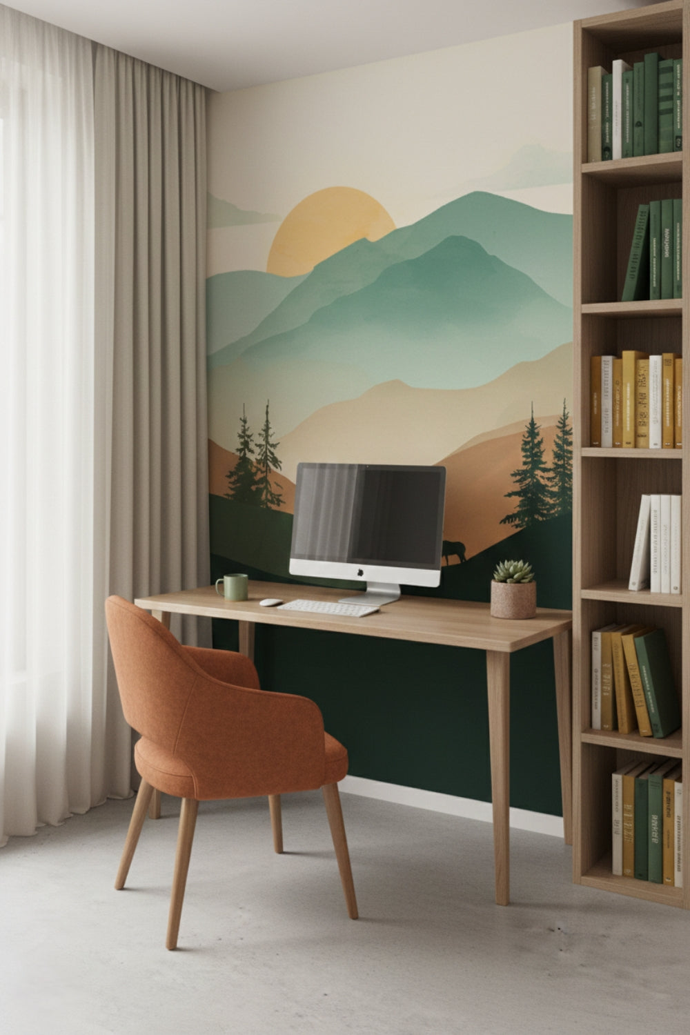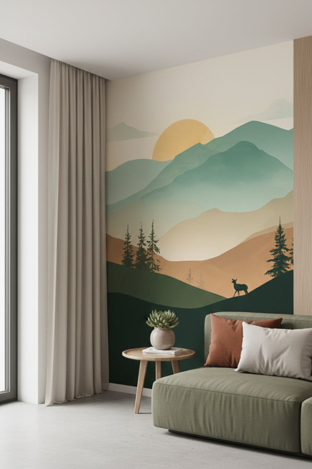 Perfect for a tranquil living room, a peaceful master bedroom, or a cozy home office, this design transforms your space with its beautiful layered landscape. The rolling mountains and majestic deer are designed to create a sense of harmony and a stylish, serene escape.